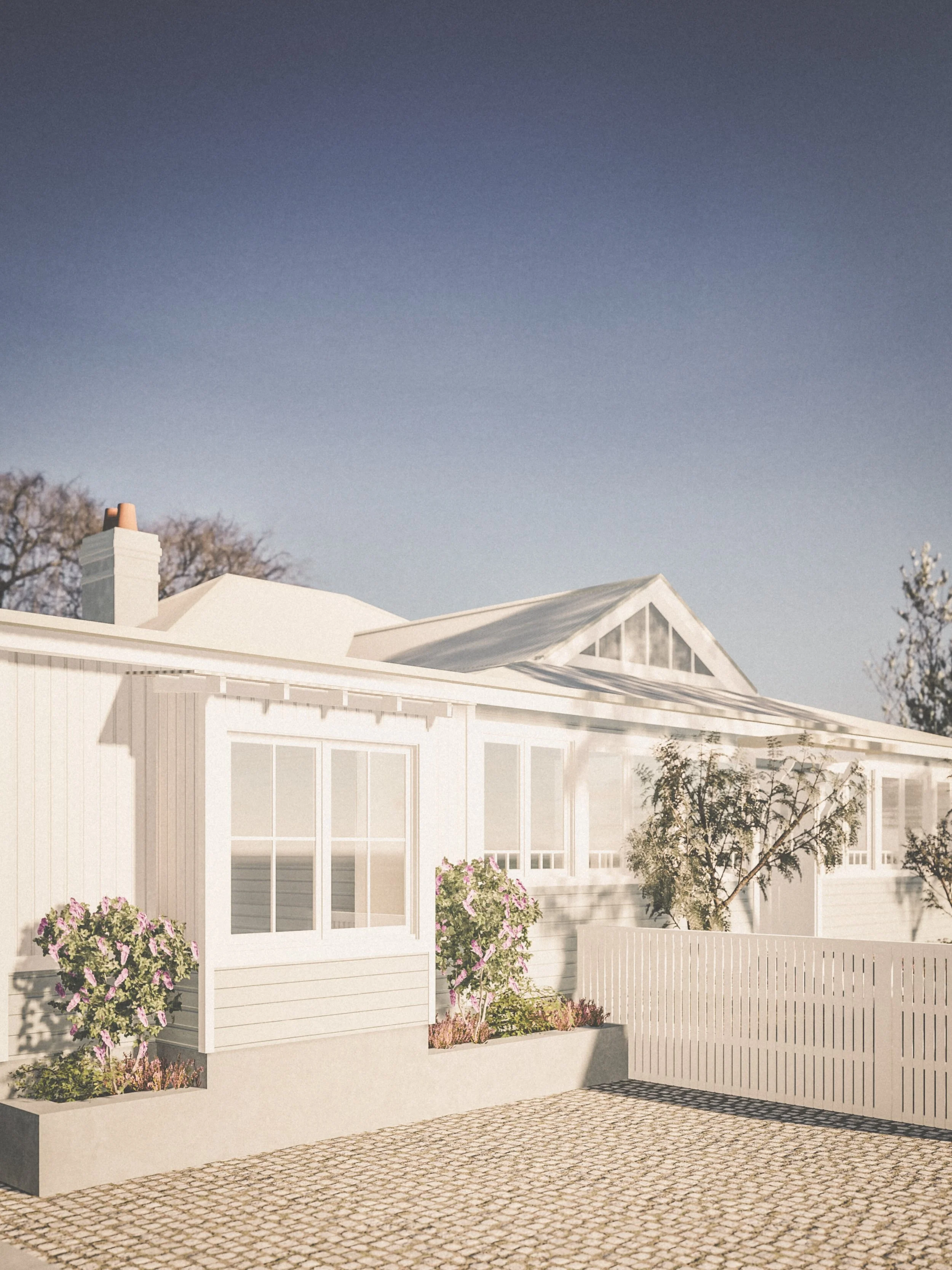 Originally built as a pair with its neighbour, the design improves visibility of the home at street level with new landscaping and courtyard fencing. The original roof line including the verandah is re-defined with the replacement of matching traditional windows and cladding. Later additions with an awkward bay window are re-cladded and detailed to highlight woodwork features representing the Federation Style and finished with a neutral colour scheme.