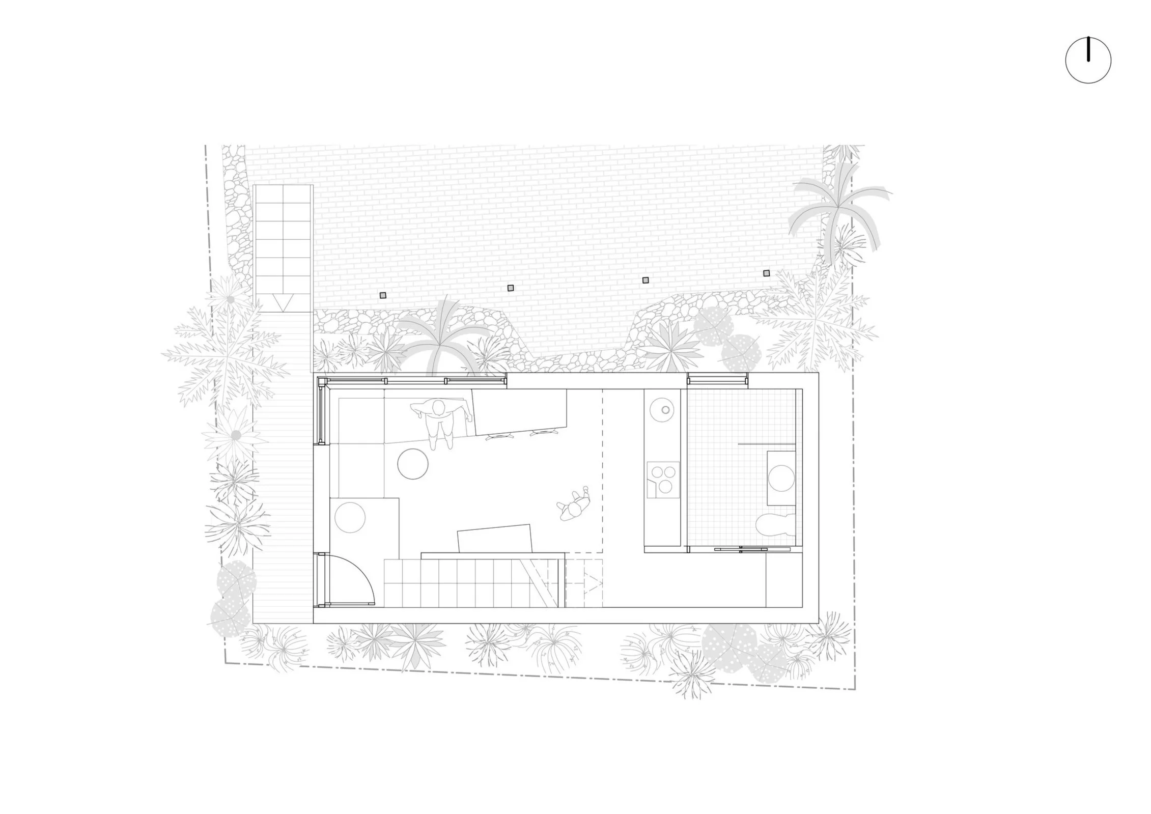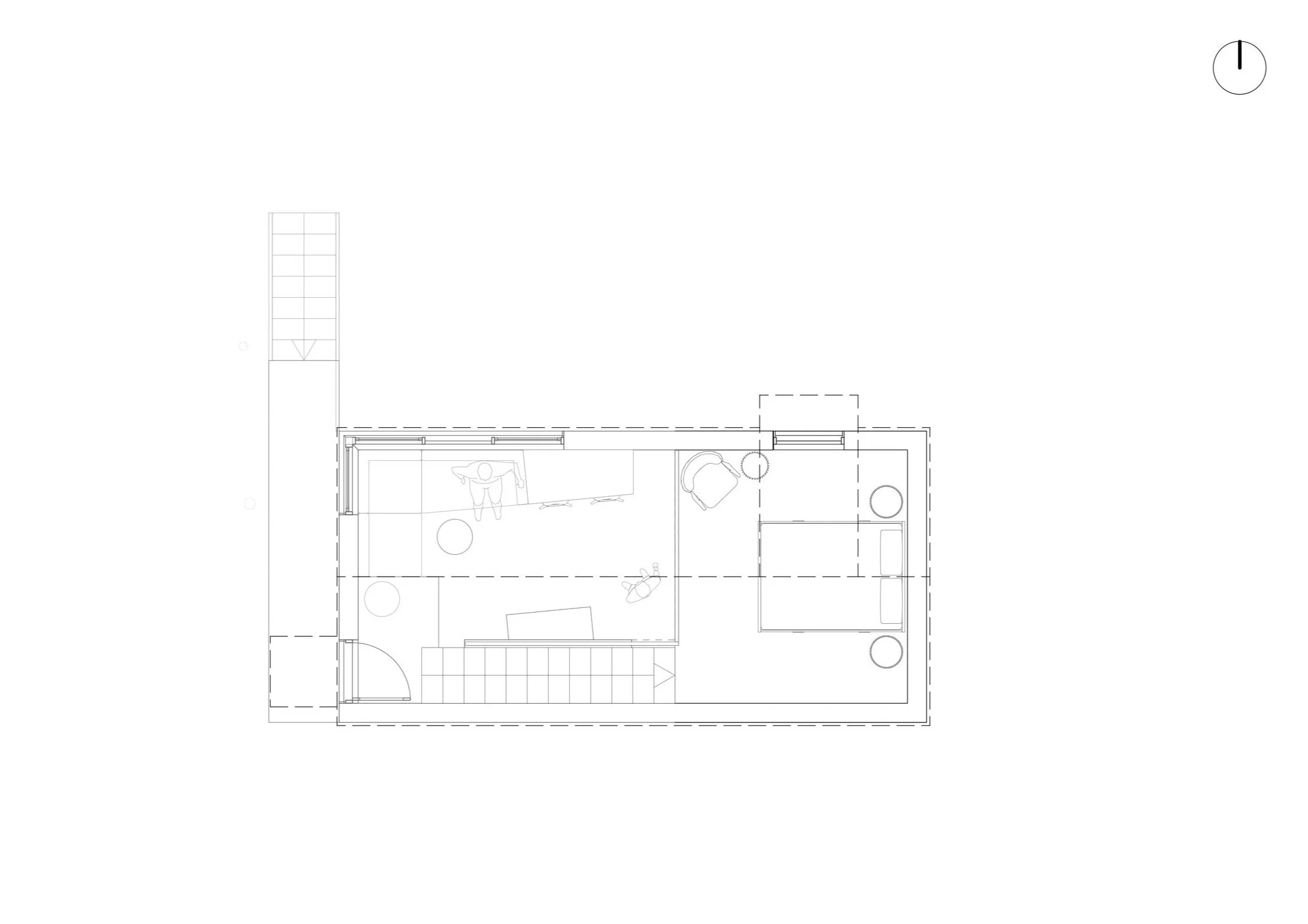 A change in level and small landscape buffer separates mini-HAUS from the existing cottage. Contained within the allowable footprint, the small layout opens out from the entry stepping down into a double height living area with kitchenette and bathroom tucked in around the corner. There is space for a laundry cupboard and access to storage below the stairs.