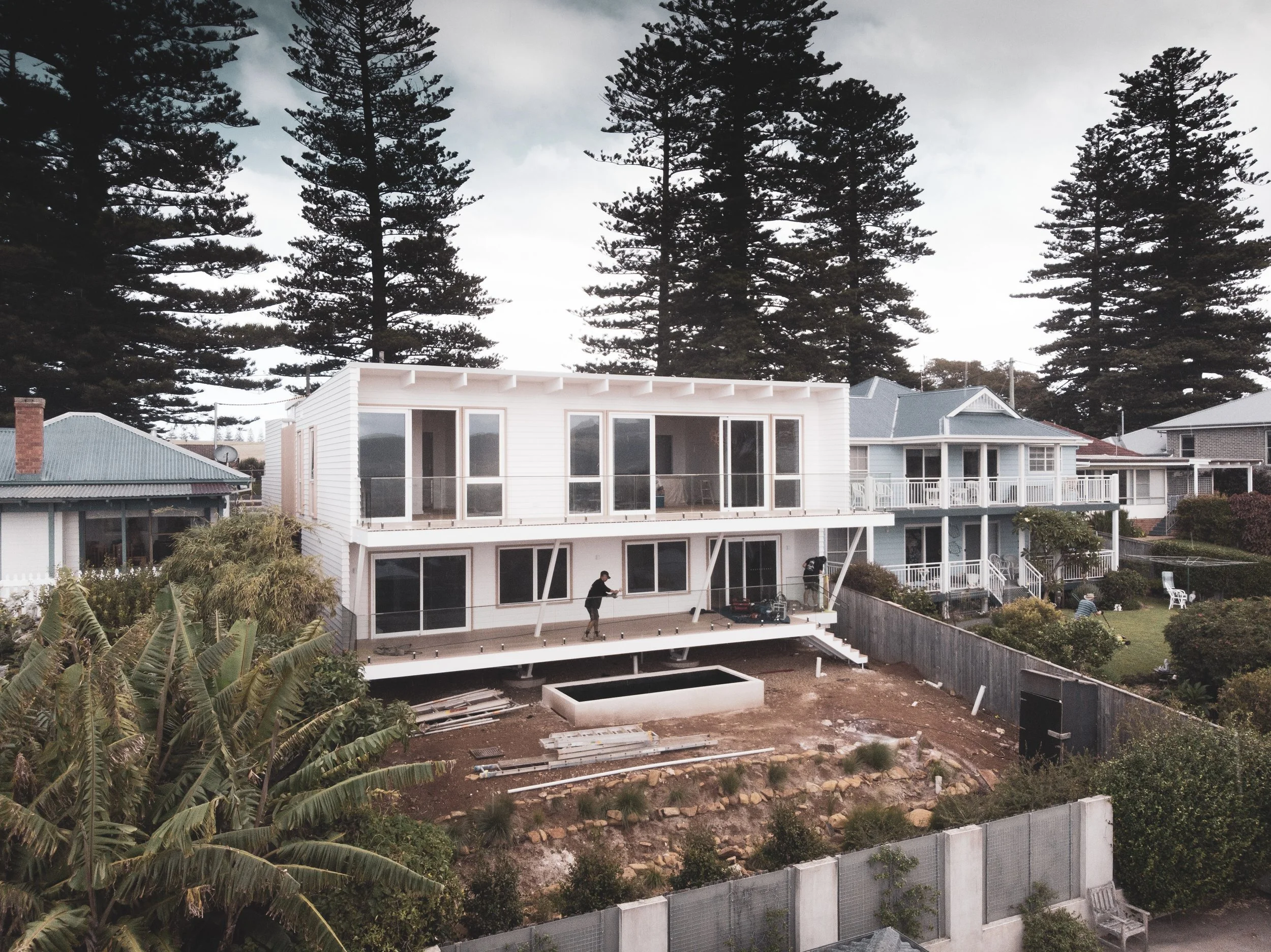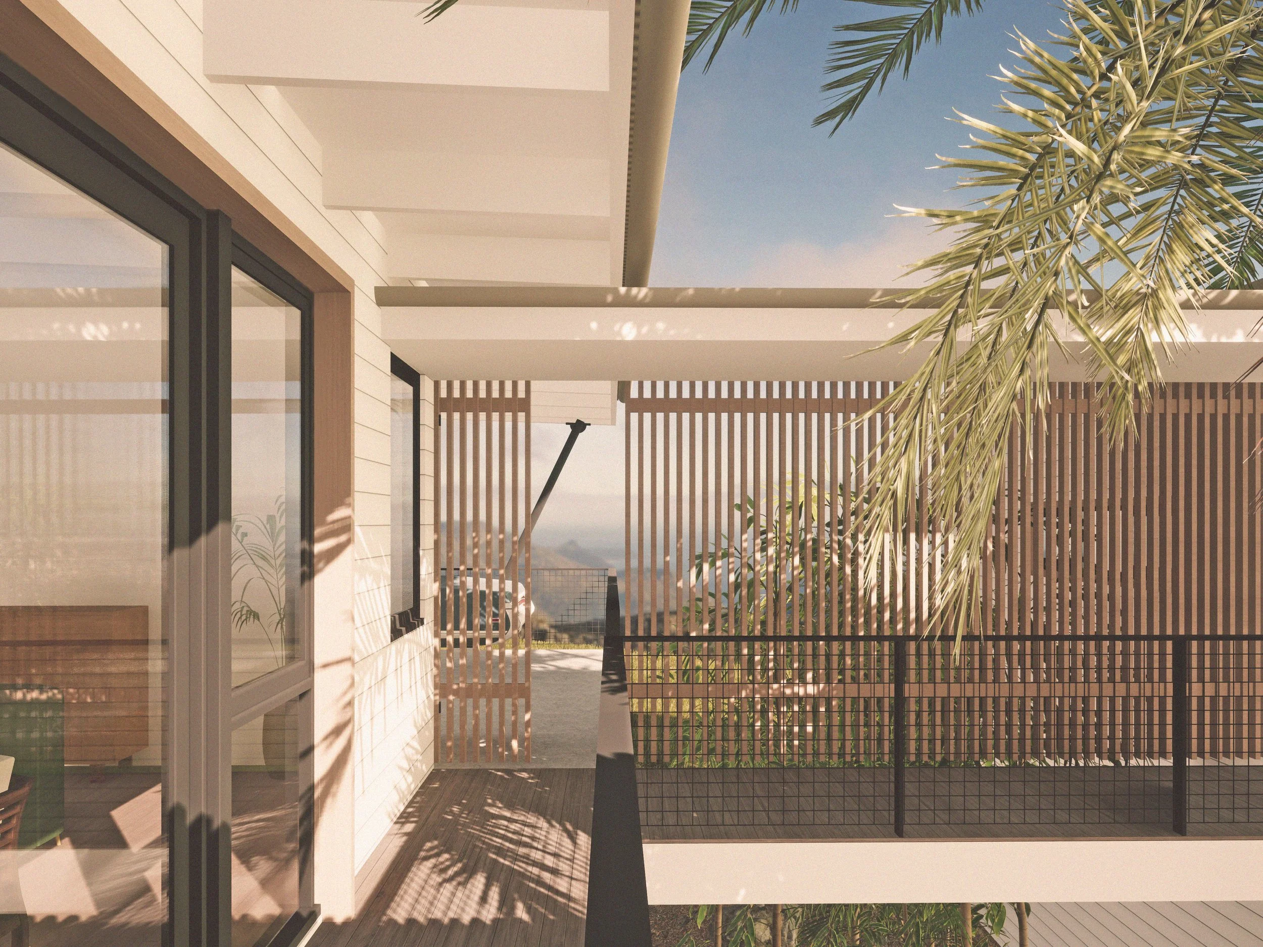 Exterior detailing combines exposed framing members, timber batten screens and traditional weatherboards, creating a coastal vibe in keeping with the beachside location.