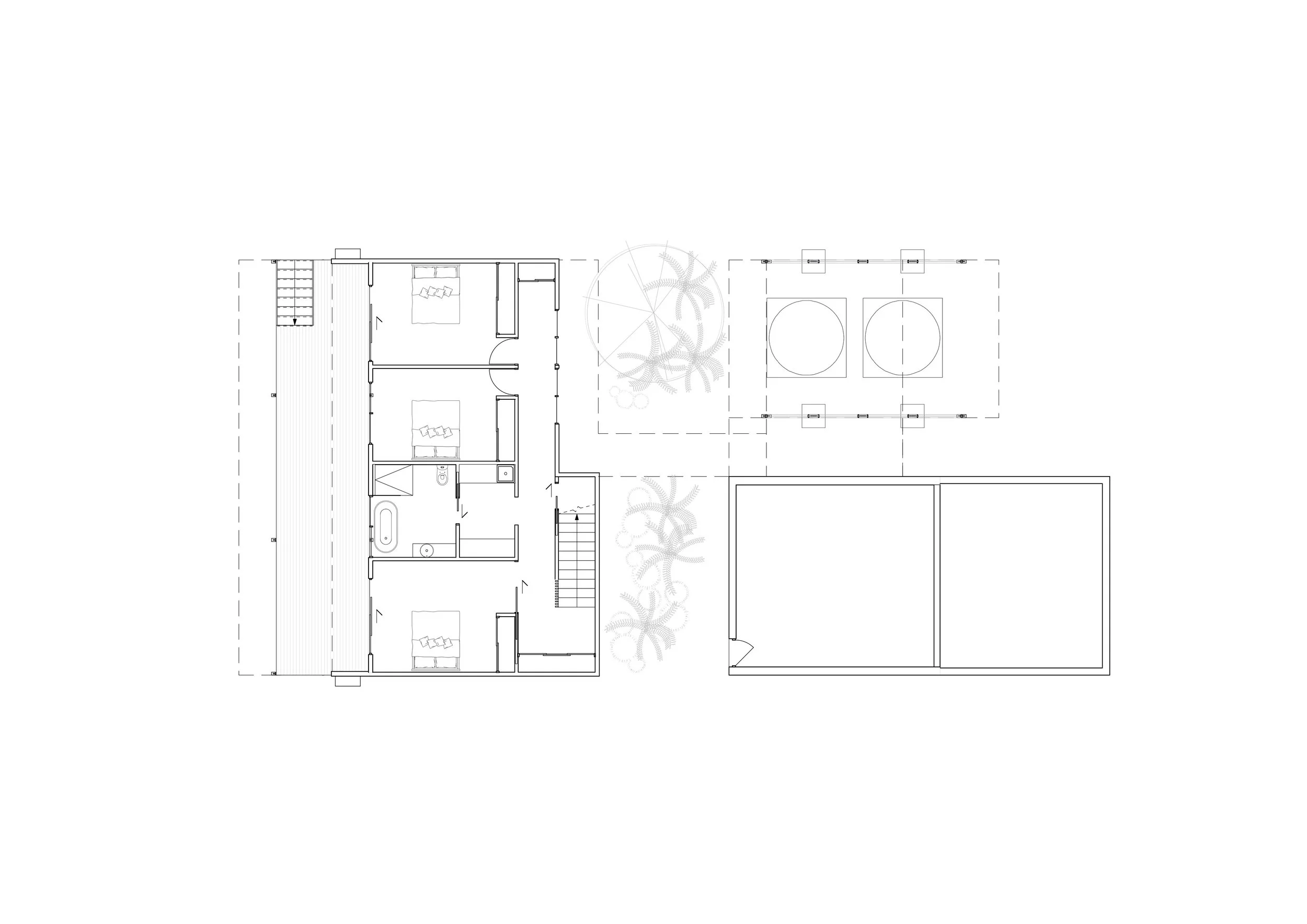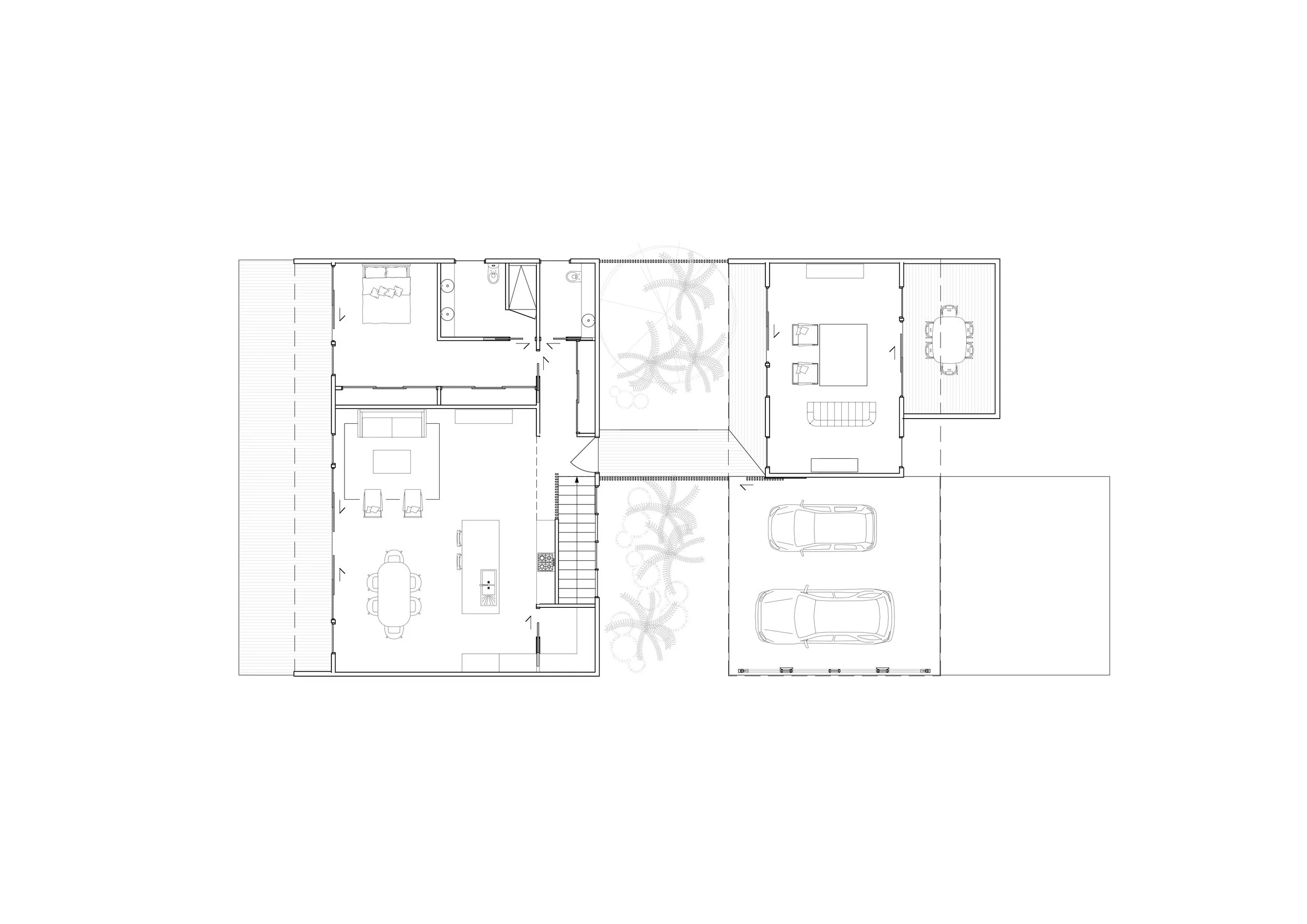 The split pavilion layout is a means for each space within the home to enjoy sunlight and an aspect of either the beach beyond or the private garden.