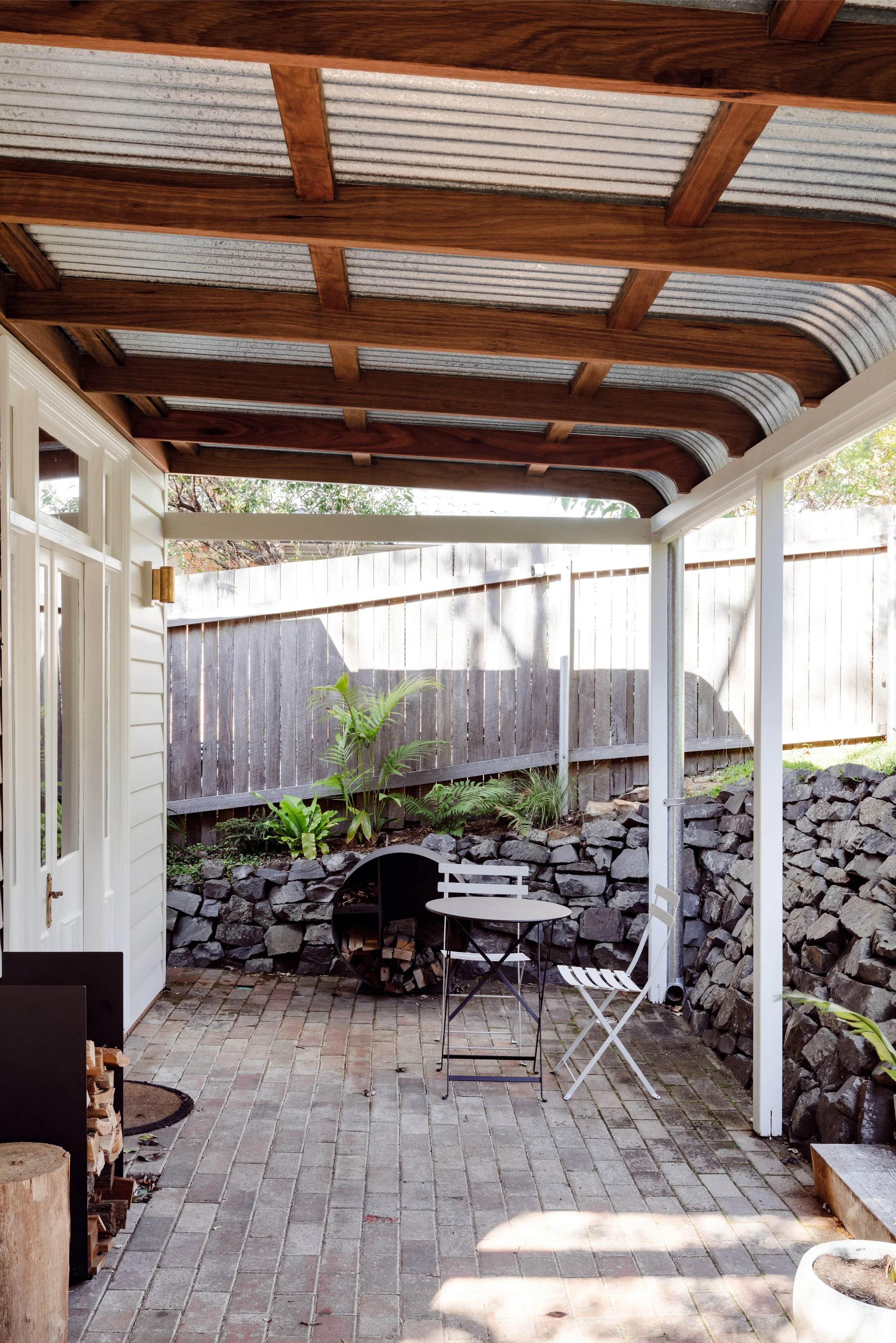 A key detail to execute was the street facade. Searching photographic records available, we replicated the original bull nose verandah and discovered that many early cottages were originally unpainted. Much care was taken by our tradesman in removing, stripping and restoring the last surviving original cladding to reveal 130 year old mixed hardwood timbers that once clad the full exterior. The original double hung windows were serviced, cables repaired and repainted.